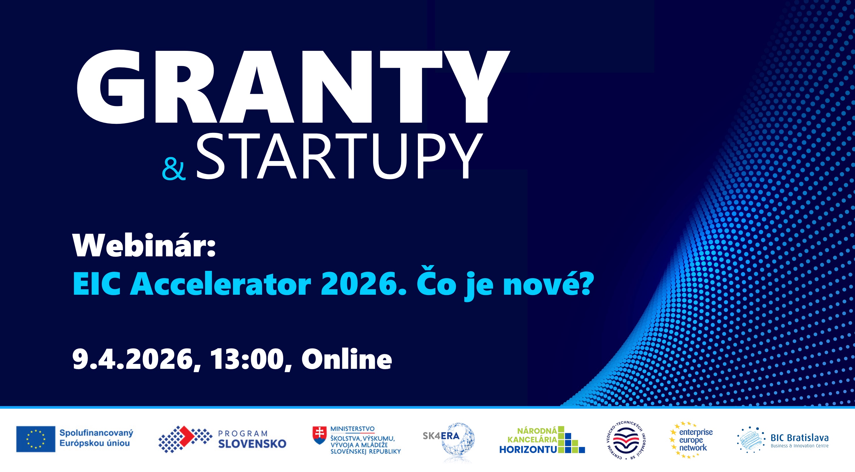 Máte startup s prelomovou inováciou, ktorá má ambíciu zmeniť globálny trh? Plánujete podať žiadosť do programu EIC Accelerator alebo zvažujete, či je tento nástroj vhodný pre váš technologický startup? Príďte na náš webinár a zistite, aké zmeny prináša rok 2026, ako bude fungovať nový hodnotiaci proces a čo bude rozhodovať o úspechu projektov.